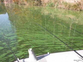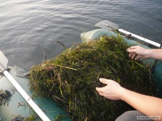 Další záběr okolo oběda a na podložku se podíval slušný kapr 8kg, další záběr byl od kapra k 60cm. K večeru se rozezněl pomalou jízdou pípák a po pár manévrech v silném větru se mě podařil podebrat pěkný kapr s váhou 8,6kg. Po setmění se nedělo vůbec nic a překvapení nám udělalo ranní svítání. Naplavaly před nás až 4m trsy trávy a řas a voda byla naprosto nechytatelná, tak jsme museli nasednout na loď a všechnu tu trávu posbírat a odvést na břeh – po 2 hodinách vyzmrzání a promočení se nám to povedlo.