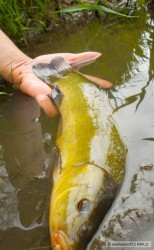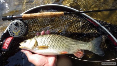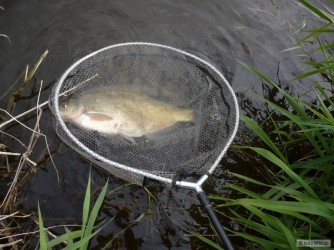 Tak dnes jsem zvažoval 2 možnosti (obě byly řeky) kam na chvilku odpoledne zajet aby to mělo smysl. Nakonec jsem si jednu zvolil a jel. Jenže jsem zapomněl na jedné křižovatce správně odbočit. A protože se mi nechtělo otáčet, tak jsem to vzal jako znamení že mám jet na tu druhou. A nakonec jsem nelitoval. Záběrů sice málo, ale nakonec jsem přece jen 6 ryb chytil. A jedna z nich mi to malé množství bohatě vynahradila. Kapřík rovných 73cm s figurou jak sazan. A proud uměl opravdu velmi dobře využívat. Dal mi pořádně zabrat než jsem ho dostal do podběráku. Navíc byla voda velmi průhledná a tak jsem mohl zblízka sledovat jaké neuvěřitelné manévry dokáže ryba dělat když se snaží dostat z háčku. Kotrmelce, piruety a vůbec všechno možné. Naštěstí mu to nepomohlo a musel na chvilku na břeh na focení. Takže spokojenost - udělal mi fešák velkou radost :-)