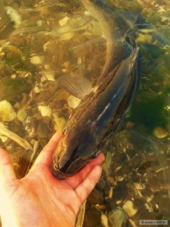 Po pátečním nezdaru,když mi uteklo pár pěkných sivenů, jsem se dnes pokusil na stejném místě o reparát a hned při příchodu jsem vyplašil volavku na lovu. Siven se nepodařil žádný a z těch co jsem zahlédl při břehu mělo několik šrámy po útoku volavky. No nic zkusím to příště a třeba tam budu pro změnu dřív jak ten pták. Náladu mi spravil výstavní svižník.