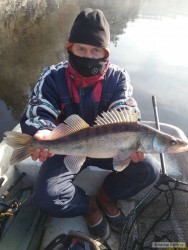 Byla to rychlá akce na svazovce a byl z toho tehle pěknej 17kg těžkej šupík. Sice už moc ve studené vodě nemakal, ale radost velká :) Snad mi to ještě nezamrzne!