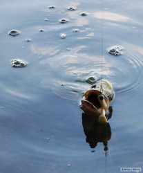 Můj lov je spíše příběh zoufalého rybáře, než skutečný lov. Dnes jsem se rozhodl zahájit a to ve velkém stylu... vybavil jsem se na okouny, sumce a univerzál. Vyrazil na místo, kde včera okouni hojně lovili... nic, ani ťuk, šel jsem dál skrz kopřivy, abych zjistil, že potokem neteče skoro žádná voda, tam se chytat nedalo, navíc mě našlo takové množství komárů, že by i velcí rybáři z amazonie mohli závidět... fuj. Vrátil jsem se na rybník, usedl na skalku a začal zkoušet okouny na malého twistra, přiletěla zubatá a ucvakla ho na první dobrou, doufám, že jenohák bez protihrotu vyklepe bez obtíží... Pak mi spadly dvě malé potvůrky na woba, nevím co to bylo, ale nemělo to ani 5 cm... Abych závěrem, když už jsem chtěl psát, že jsem pouze vázl, trhal a nic nechytil, lapil na naprosto čistém místě, vedle silnice candátka tak 20. Hlavu jsem si vyčistil, ale šťastný rybář nejsem... Spálenej a poštípanej rybář jsem