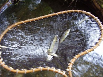 Kde to funguje. jak má.Z dnešní kontroly stavu populace a samovýtěru. Tento potok mám rád.Pstruhový rybník, který je skutečně pstruhový.Z něho táhnou PO do potoka na samovýtěr a po vysazení před několika lety se tam udržuje sám i lipan.Po tom co odrostou , část splave zpátky do rybníka.Stačí několikrát vysadit po pár desítkách duháků nebo sivenů pro zpestření a ryb je pořád dost.Někdy se najde zajímavá kombinace jako na první fotce-nalevo potočáček,uprostřed duháček a napravo lipánek.Ti se vyskytují několik stovek metrů nad rybníkem a je jich ze samovýtěru dostatečný počet pro udržení populace.Pod prahy jsou PO různých velikostí,nově vybudovaný práh má už své obyvatele a občas se najde mamina PO,která se už pěkně zakulacuje.Prostě potok jak má být.Petrův Zdar