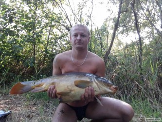 Po cca 5 hodinách lovu přišla pomalá jízda.Během několika vteřin se kapr dostal do spleti rostlin,které místy dosahují až k hladině a tím zdolávání ze břehu byl konec.Následovalo potopení se po vlasci k rybě.Po vyjetí kapra z trávy jsem se docela lekl jeho velikosti,protože se mi zdálo,že bude o dost menší.Zdolávání kapříka na vlasci byl neskutečný zažitek- celou dobu se nechal táhnout jako pejsek na vodítku jen do podběráku se mu moc nechtělo,jelikož po poklidném doplutí ke břehu byl plný sil. 80 cm 9,5 kg