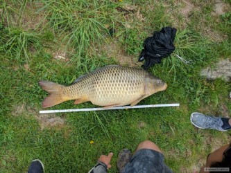 Fakt už si musím pořídit větší podběrák. 93 cm, poslední nához, přes 20 minut boje na feeder na 16 návazec. adrenalin na 100%, děkuji kolemjdoucím za asistenci při výlovu rukama a "děkuji" "kaprařům", kteří mi nechtěli půjčit větší podběrák?? Omlouvám se za špatné držení a za fotku bez podložky, fakt jsem nešel na takovýhle ryby :-)