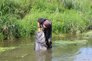 Neuvěřitelný asi půlhodinový souboj na feeder s vlascem 0,18 se štastným koncem pro mne i pro amura. 94 cm nevážen a vrácen zpět do Sázavy. Nástraha minipeleta a plovooucí boilie. Děkuji kamarádovi Martinovi za podebrání ryby, neboť dostat tuto rybu do standartního podběráku nebylo nic jednoduchého.