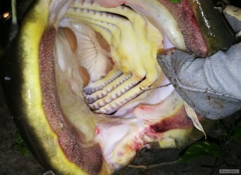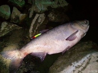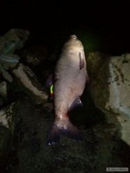 Okamžitě začaly mizet desítky metrů šňůry ve tmě. Hladina adrenalinu byla během chvilky na svém maximu.Bylo nutné rybu zastavit a otočit, než vymotá bzučící cívku navijáku. Nasleduje dotažení brzdy, ryba se otáčí. Během souboje se do toho ještě přimotá i vysoká nervozita z blížící se bouřky. Jsem hluboko v divočině několik km od auta. Snad to stihnu říkám si. Za necelou hodinu bylo dobojováno a výsledek byl docela neočekávaný a nechtěný úlovek. Naměřeno 122 cm (možná byl o něco větší), těžkej jako prase :-).