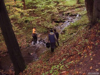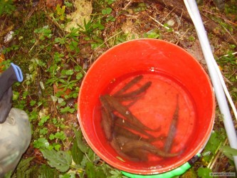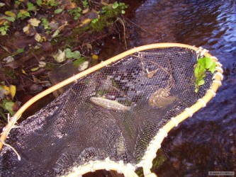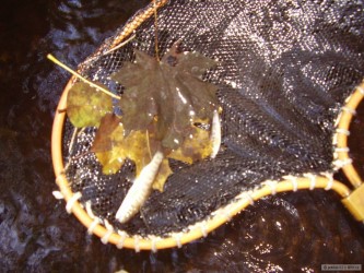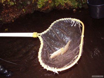 Jako poslední byl zkontrolován úsek potoka,kde bylo v lońském roce vybudováno 40 prahů a usměrńovačů proudění.Projito zhruba 50 m s 5 prahy a dvěma usměrńovači.I když se nelovilo nějak důkladně,tak napočítáno 53 půlročních PO,6 dvouročních a dvě vranky.Do tohoto úseku byl pro urychlení obnovy populace na jaře vysazen omezený počet váčkového plůdku PO. Petrův Zdar