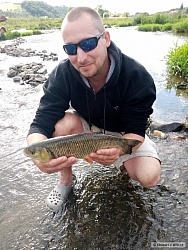 Při chytání na mrtvou rybku jsem očekával na druhé straně prutu rybu z trošku jiné kategorie, ale nestěžuji si :) Chycen za tlamu.