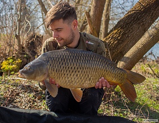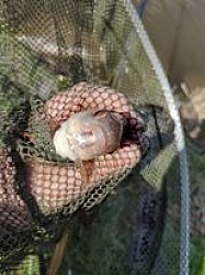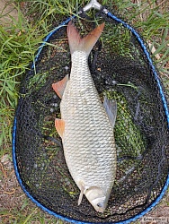 Pěkná ryba, ani jsem netušil, že v řece takhle velcí plavou. Karas stříbřitý 45, feeder, rohlíkové boilies 12 mm. Asi odměna za to hrozné včerejší počasí.