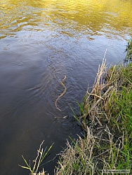 Dnes na pstruhovce trochu pikanterie-pozvolný tah,jak když táhneš větev,pak se to začíná motat,co to sakra je.Za chvilku se to vynoří,trochu zděșení-had,užovka,za triko.Po chvíli motání hada i mém úspěšně odháčkován a vypuštěn zpět.Uf,hady moc nemusím,ale vidêt to manżelka,tak to s ní sekne a plave do Černého moře.Jinak ještě zajímavě zbarvenej duhák.