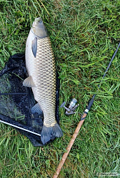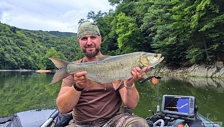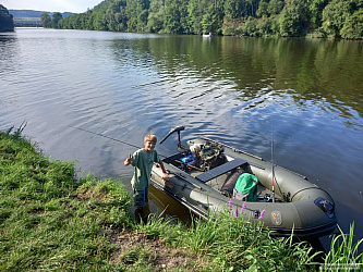 Tak jsem vyrazil v těch vedrech zkusit chytit nějaké to Ruské torpédo z řeky Amur. Natrhal jsem kýbl žlutých blum a proložil je naklíčenou pšenicí. První den se nic nedělo, ale druhý den po obědě to klaplo. Zažít záběr patnácti kilové ryby v tři čtvrtě metrové hloubce za největšího pařáku je neskutečný zážitek. V prvním okamžiku to vypadalo, že do vody skočil chlap. Píchnutá ryba vylétla na hladinu a začalo solidní rodeo. Po desetiminutovém souboji Amur ležel v kolébce a rodeo pokračovalo před foťákem. Já zmáchaný od ryby, čočka foťáku taktéž, ale jedna rychlá fotka na památku se povedla. Povedlo se zdolat tři Amury na délkách 105,103 a 88 čísel. Všechny ryby během chvilky v pohodě odpluly a třeba zase někdy příště.