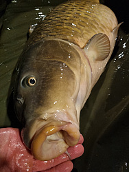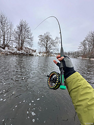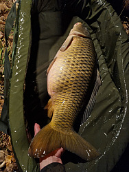 Na oboje mi tentokrát brali jen tloušti a cejni. Kolem osmé už jsem chtěl jet pomalu za přítelkyní do tepla a přišla jízda jako řemen. Pěkný souboj a nevěřil jsem vlastním očím. Po tom, co jsem se radoval i z malých kaprů, tloušťů atd. jsem měl v podběráku pořádnou kobylu na prut s peletou. Nádherný dlouhán nažraný peletama přes 90 cm a přes 13 kg. Můj největší kapr z téhle řeky přišel v prosinci ve dvoustupňové vodě. Na to do smrti nezapomenu a je to jeden z mých nejcennějších úlovků.