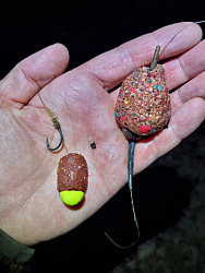 Tyto poslední dva večery už jsem krmil jen mixem pelet, které prostě v té studené vodě fungují úžasně. Mixem sladkých, masových a řepko / konopných pelet jsem se nebál řádně zakrmit a po každém záběru dokrmit. Testoval jsem nový method mix. Ten jsem na jednom prutu dával do krmítka a k tomu rohlíkáč a na druhý jsem s ním obaloval olovo a k němu dával peletu s půlkou popky.