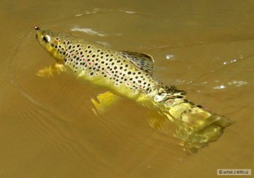 Voda byla po pondělní bouřce ještě přikalená, ale přesto se větším pstruhům dnes moc nechtělo. Až na jednoho letos již podruhé chyceného čtyřicátníka.