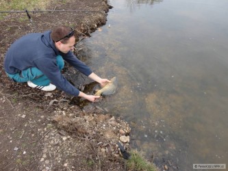 dnes na 2 hoďky k vodě a lov poblí břehu na kuku , ovšem kapříci najeli až po hodině a ze čtyř proseků jsem se trefil do tohoto krásně stavěného , barevného odhadem tak 45cm kapříka , plave dál :)