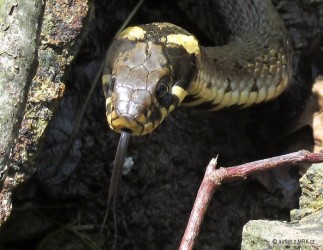 Voda se už celkem odkalila, ale ryby úplně přestaly reagovat na smáčky a tak je vystřídaly banja. Rozdíl v počtu záběrů byl až neuvěřitelný, ale na druhou stranu jsem je trhal stejně úspěšně jako smáčky. Užovka mi tentokrát postála dokonce na tři fotky, jenže potom ji to přestalo bavit, vyplázla na mě jazyk a zmizela v kopřivách.