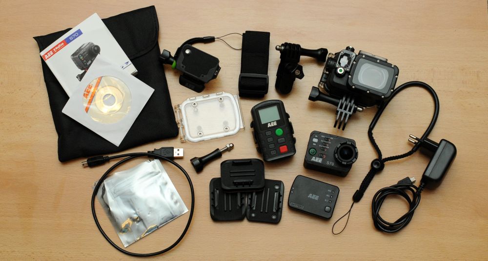 Dále je v balení druhá baterie, USB-kabel, nabíječka, kterou lze nabíjet kameru i dálkový ovladač, pásek k přichycení dálkového ovladače, menší kryt pouzdra k použití kamery bez zadního displeje, plátěný obal na kameru, šňůrka k přichycení kamery například na ruku a několik různých držáků a úchytů, které umožní připevnit kameru na rovné i zahnuté povrchy. V balení je vícejazyčný návod (čeština nechybí) a také CD s kompletním elektronickým manuálem, také v češitně.