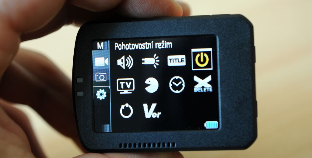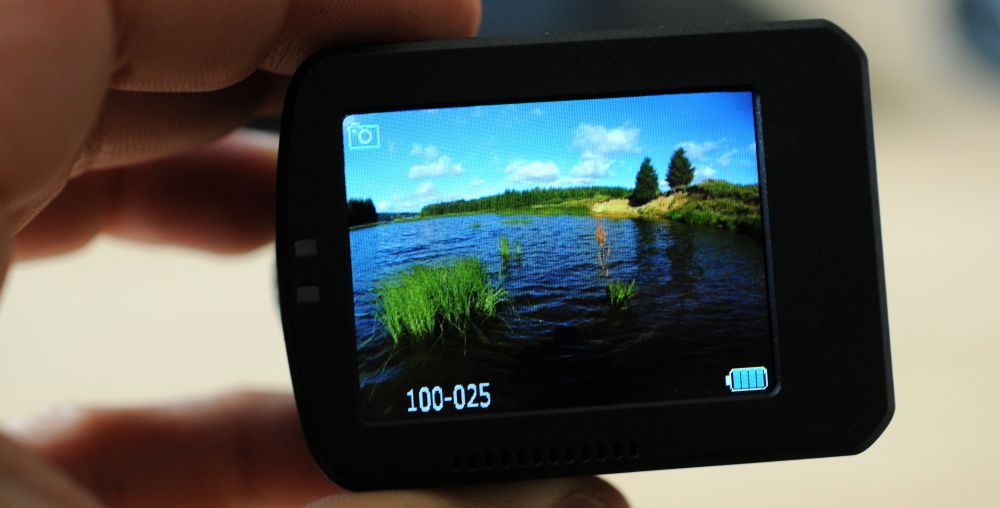 Krom kamery a vodotěsného pouzdra je v balení velké množství příslušenství, které se k obdobným kamerám musí draze dokupovat, což je rozhodně velkým plusem této kamery. První věcí, bez které jsem kameru příliš nepoužíval, je zadní dvoupalcový displej (úhlopříčka cca 5 cm), na kterém se dá sledovat obraz při natáčení, prohlížet pořízené záběry a fotografie a hlavně nastavovat parametry záznamu a další funkce kamery. Menu je přehledné, a co je velmi důležité, je v českém jazyce. Obraz je na disleji dobře vidět i za slunečného počasí. Nevýhodou používání zadního displeje je kratší výdrž baterie oproti provozu bez displeje.