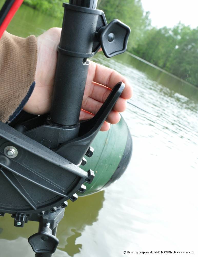 Tyč neboli rameno motoru tvoří kovová trubka o průměru 2,8 cm dlouhá 91 cm. Díky tomu lze motor (střed vrtule) ponořit až do 70 cm od hrany čela člunu. Celková výška motoru je 120 cm. Ponor motoru se reguluje svorkou na tyči s pětihrannou maticí. Druhou takovou maticí v dolní části závěsu motoru se reguluje odpor při zatáčení. Pokud je dobře nastavený, motor drží směr, kterým ho natočíte.Sklápění celého motoru je velmi snadné a pohodlné, protože páka na sklápění je opravdu velká. Západka je z kovového hranolu a ozubení na uchycení motoru umožňuje zaaretovat motoru do různých úhlů.