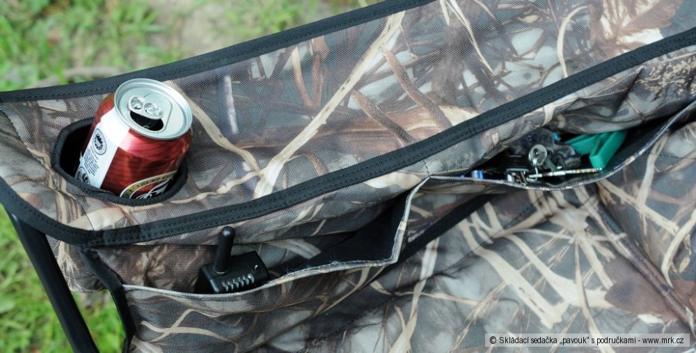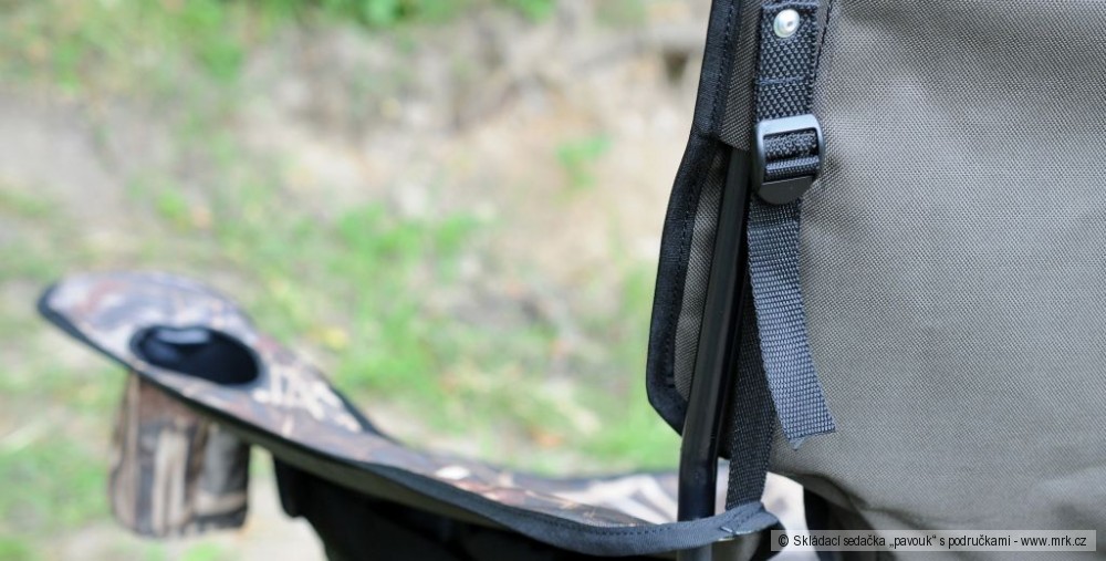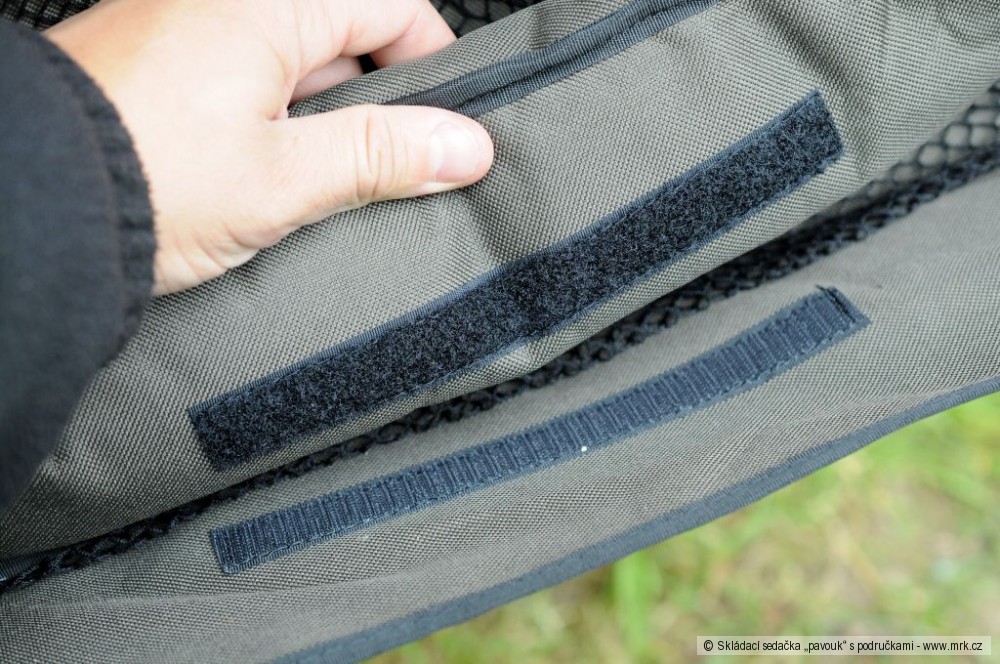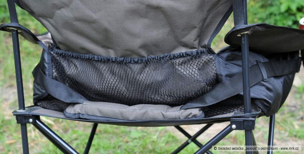 Oproti běžným sedačkám s takovouto „pavoučí“ konstrukcí je potah ušitý velmi prakticky. Například mezi sedákem a područkami nejsou mezery, ale „bočnice“. Ty vás ochrání proti větru zboku a navíc jsou v nich čtyři velké kapsy (cca 25 x 13 cm). Obě područky jsou vybaveny kapsou na láhev nebo plechovku, ale dá se do nich vložit cokoliv. Rozměr těchto kapes je 8 cm v průměru a jsou 12 cm hluboké. Výška područek je díky řemínkům na opěrce nastavitelná. Sedačka je vybavená ještě jednou velkou kapsou (cca 40 x 20 cm) ze síťoviny, která je umístěná na zadní straně opěrky. Zvenčí je po obvodu sedačky popruh na přenášení, který je pod zadní kapsou přichycený suchým zipem. Popruh má velký polstrovaný polštářek, aby neřezal do ramene. Mám-li to shrnout, jedná se o velkou a pohodlnou sedačku s pevnou konstrukcí. Jeden můj „objemnější“ kamarád říká, že to je jediná sedačka, která ho udrží. Její předností je hlavně velikost – je tak velká, že se na ni vejdu i se svou drahou polovičkou. Sám na ní sedím jak král na trůně a mohu se rozvalovat dle libosti. Oproti běžným křesílkům stejných rozměrů je lehčí, skladnější a s cenou kolem čtrnácti stovek i levnější. Celkem sedm velmi praktických kapes ocení snad každý rybář, ať už jde k vodě na chvilku, nebo na několik dní. Stejně tak integrovaný popruh s mohutným polstrováním jedině potěší. Jedinou nevýhodou plynoucí z dané konstrukce je nemožnost postavit sedačku v libovolném terénu. Drobnější nerovnosti sedačka vyrovná, ale narozdíl od křesílka nelze měnit délku jednotlivých nohou a je třeba sedět na rovnějším místě. A abych nezapomněl – jedná se o český výrobek.