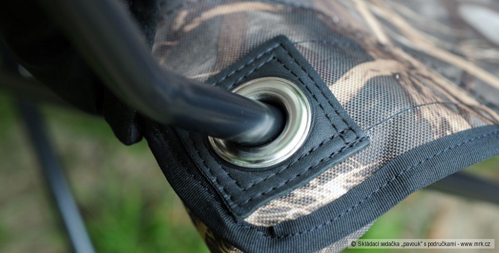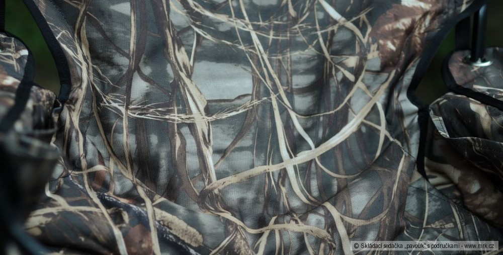 Základem sedačky je konstrukce z deseti ocelových trubiček o průměru 15 mm a tloušťce stěny 1,2 mm. Trubičky jsou natřeny černou vypalovací barvou. Ve srovnání s klasickým křesílkem se zdají slabé, ale je třeba brát v potaz, že křesílko nesou čtyři nohy, zatímco sedačku zvanou pavouk podpírá celkem deset trubiček, mezi které se zatížení rozloží. Trubičky jsou spojeny nýty a osmi plastovými „klouby“, které jsou v rozích. U této sedačky jsou na „klouby“ použity masivní plastové odlitky. Oproti křesílku stejné velikosti a nosnosti je tento systém mnohem skladnější a také o nějaké kilo lehčí. Složená sedačka má rozměr 95 x 20 x 20 cm a váží 4,5 kg. Jedinou nevýhodou této konstrukce sedačky je to, že se hůř staví v nerovném terénu, protože nemá nastavitelnou délku nohou jako čtyřnohá křesílka klasické konstrukce.Potah sedačky je ze silného nylonu, který je na rubu opatřený pogumováním. Celý potah až na několik detailů je ze dvou vrstev. Zvenčí je použita látka v zelené a černé barvě. Na opěrce, sedáku a područkách je zdařilý maskáč, imitující skutečné přírodní prostředí (rákos, větve, dubové listí). Mezi obě vrstvy nylonu je na sedáku, bocích, opěrce i područkách všita měkká vložka, která chrání před chladem a zvyšuje vaše pohodlí. Pevný dvouvrstvý nylon je v místech spojení s tyčemi prošitý a zpevněný koženým plátem a ocelovým okem. Nezanedbatelná je i velikost sedačky, díky níž je opravdu pohodlná. Rozměr sedáku je přibližně 60 x 50 cm, což stačí snad pro všechny rybáře, které znám. Výška sedáku nad zemí je 40–46 cm. Opěradlo je vysoké 55 cm, takže já osobně si opřu i hlavu.