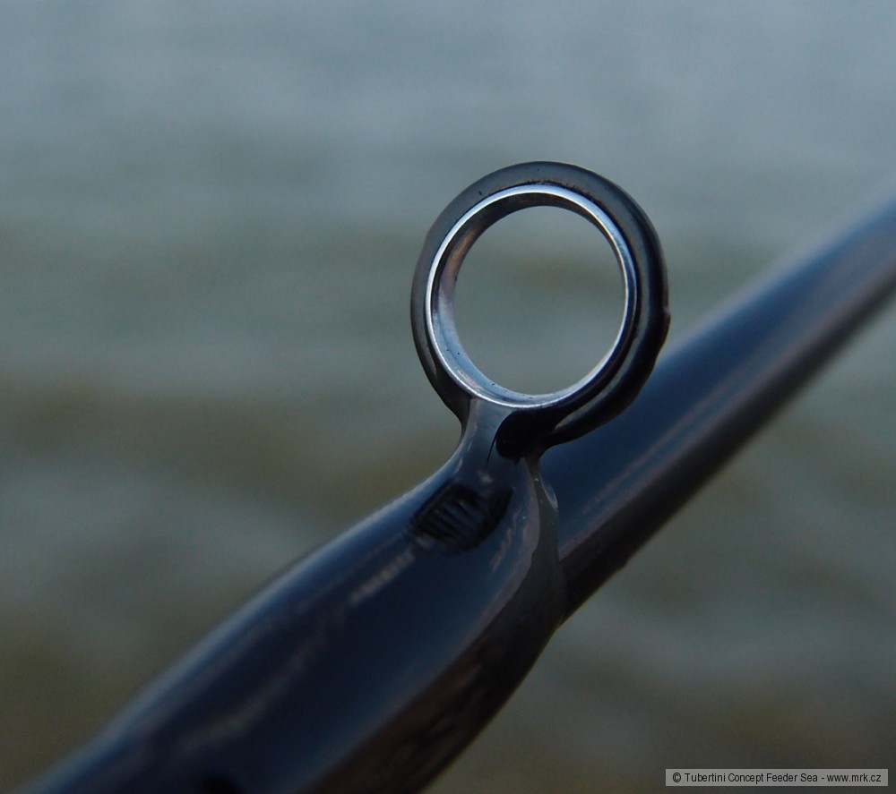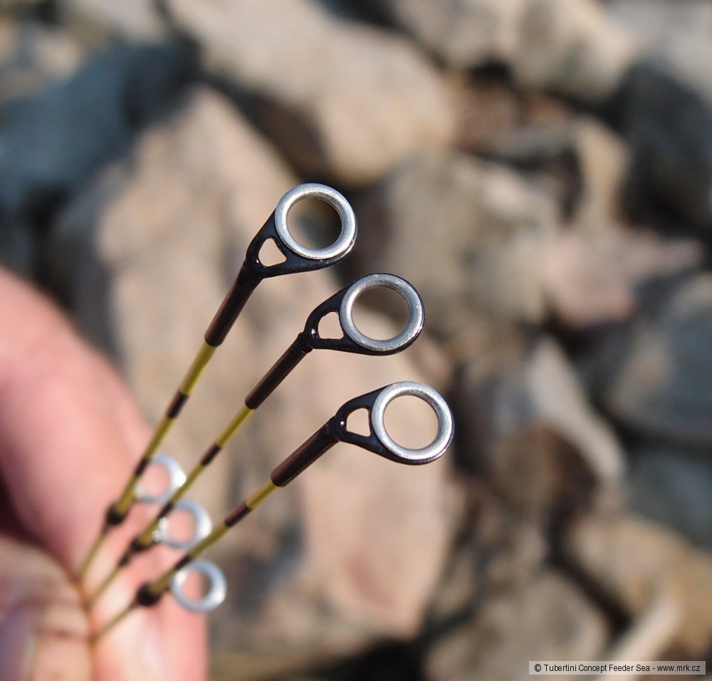 Prutu nesmírně pomáhají velká očka s kovovou výplní. Nebudu se pouštět do rozboru, z čeho vlastně jsou udělána (titan?), ale jsou velká, a přitom lehká. Těžká očka ničí akci jemných prutů - zejména na tenkých a měkkých špičkách. Jestli tento materiál vydrží alespoň to co keramika, zejména při použití pletených šňůr, to si zatím sám netroufám hodnotit, ale výrobce tvrdí, že ano. Kovová očka se již delší dobu používají na prutech na sumce, kde jsou nároky na pevnost řádově větší.