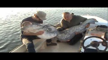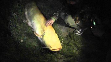 Sumec Albín 160 cm, 38 kg chycený v noci po dvouhodinovém boji s kaprařským vybavením (vlasec 30) na nádrži Ponětovice a...