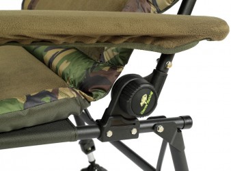 Tuhost potahu je libovolně nastavitelná pomocí chytrého systému šněrování na spodní straně křesla. Plně polohovatelné křeslo, které má polstrovanou část s termoizolační vrstvou a anatomicky tvarovaným potahem. Loketní opěrky, které jsou osazeny fleecovými návleky dělají tuto židli ideální pro dlouhodobější pobyt u vody. Čtyři výškově nastavitelné nohy, s otočnými a velkými pacičkami zabraňující zaboření do bláta.