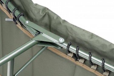 Čtyři výškově nastavitelné nohy s otočnými pacičkami zabraňující zaboření do bláta. Vysoká opěrka zad pro větší komfort, která je osazena opěrkou hlavy s vyjímatelným polštářkem. Velmi pevná ocelová konstrukce se zeleným nástřikem o průměru 22mm. Použitý materiál, po krajích polyester 600D v kamuflážovém provedení a střední část micro fleece.